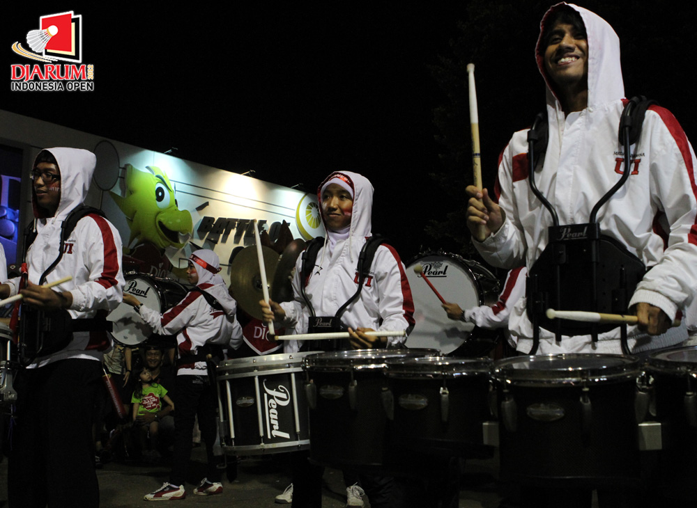 Pengunjung disuguhkan dengan atraksi marching band di halaman Istora Senayan Jakarta.