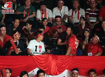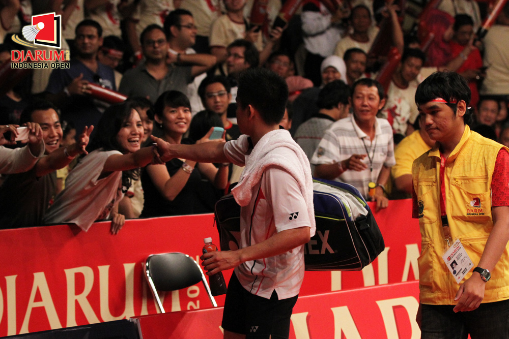 Pemain Korea Selatan, Lee Yong Dae menyalami penonton usai menang melawan pasangan Indonesia Hendra Setiawan/Markis Kido.