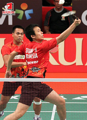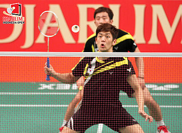 Pasangan Indonesia, Hendra Setiawan/Markis Kido berusaha mengembalikan kok ke arah pasangan Korea Selatan, Jae Sung/Lee Yong Dae.