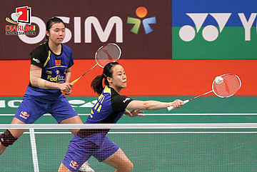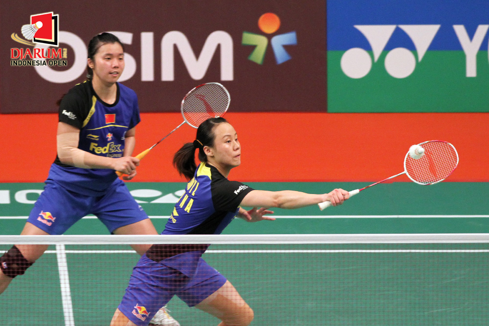Pasangan Indonesia, Greysia Polii/Meiliana Jauhari berusaha mengembalikan kok ke arah pasangan asal China, Tian Qing/Zhao Yunlei.