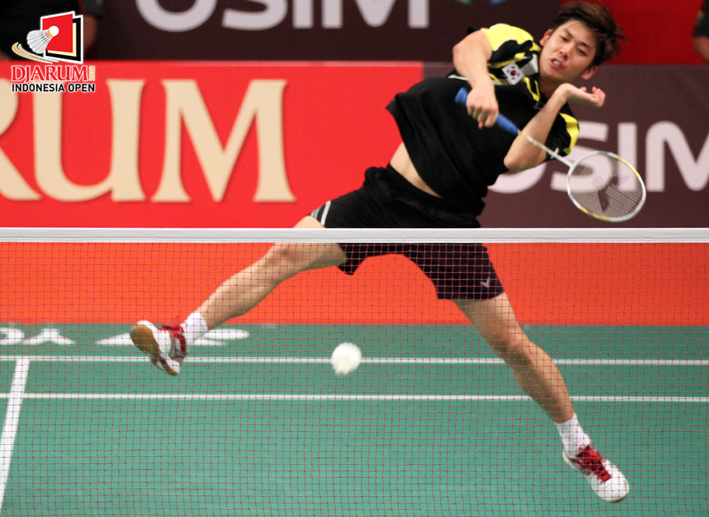 Pemain Korea Selatan, Lee Yong Dae berusaha mengembalikan kok ke arah pasangan Indonesia Hendra Setiawan/Markis Kido.