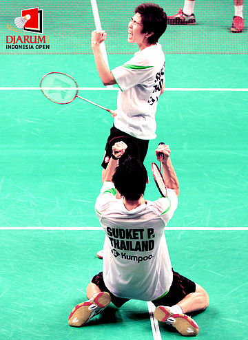 Pemain Indonesia, Tontowi Ahmad berusaha mengembalikan kok ke arah pasangan Thailand, Sudket Prapakamol/Saralee Thoungthongkam.