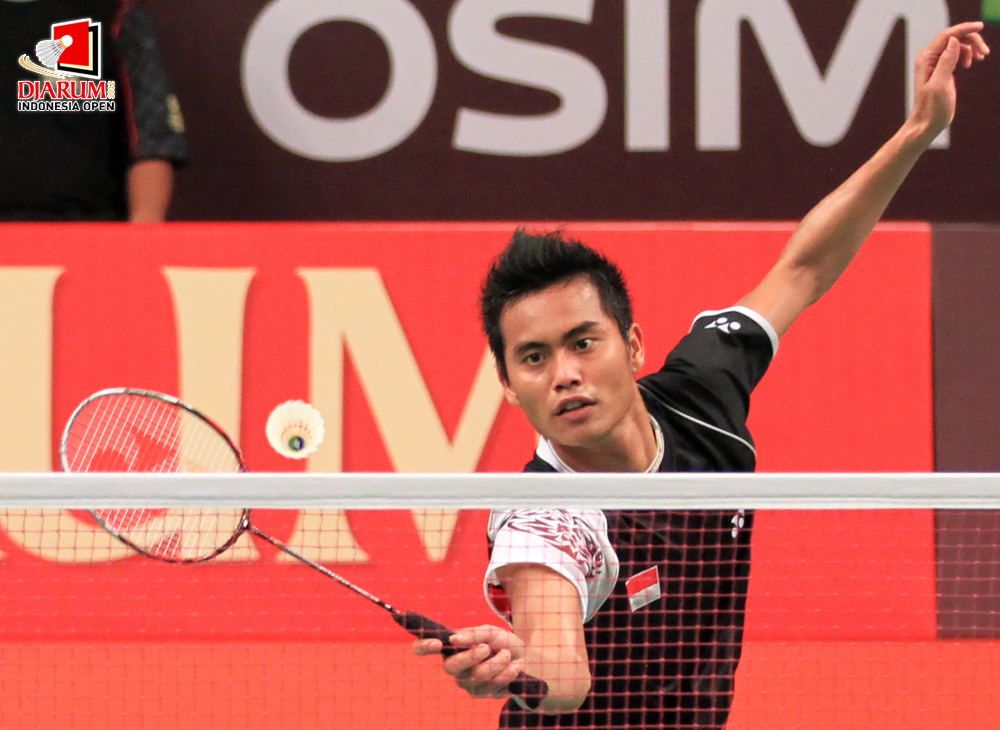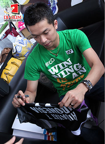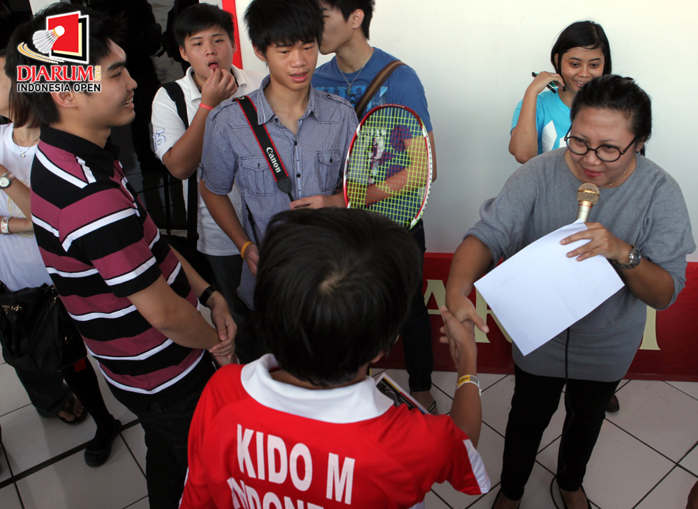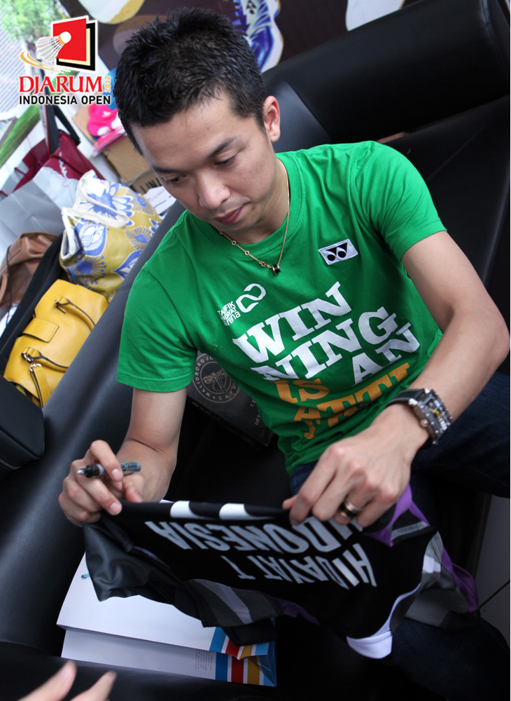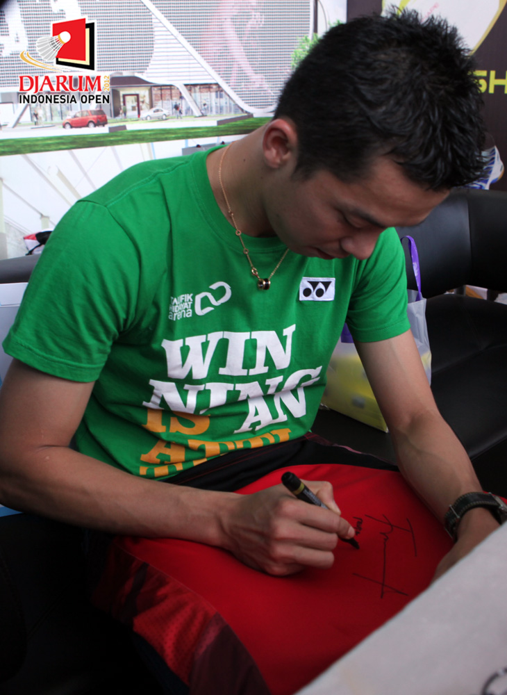 Taufik Hidayat memberikan tanda tangan di jersey yang dilelang kepada pengunjung yang hadir di Istora Senayan Jakarta.