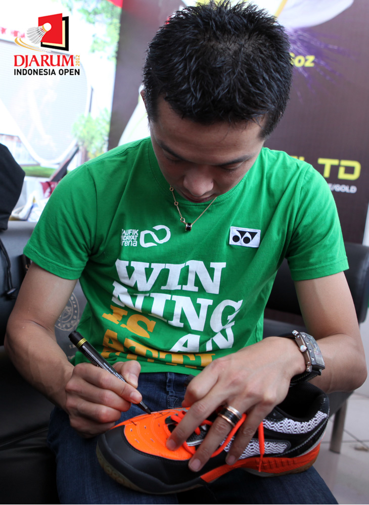 Taufik Hidayat memberikan tanda tangan di sepatu yang dilelang kepada pengunjung yang hadir di Istora Senayan Jakarta.