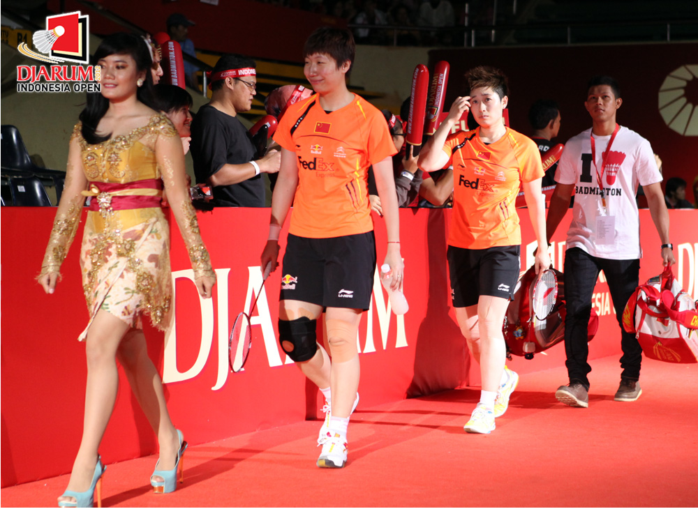 Pemain China, Wang Xiaoli dan Yu Yang tengah berjalan memasuki arena pertandingan.