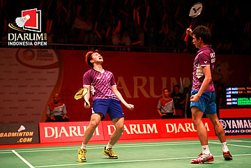 Ekspresi dan selebrasi Andrei Adistia/Markus Fernaldi Gideon (Indonesia) setelah berhasil mengalahkan Thien How Hoon/Wee Kiong Tan (Malaysia).