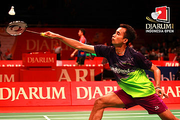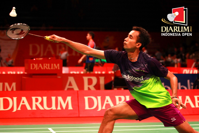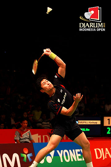 Sho Sasaki (Jepang) bersiap melepaskan smash ke arah Parupalli Kashyap (India).