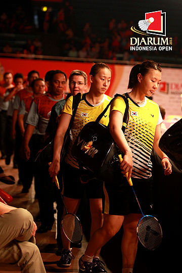 Pasangan ganda putri Korea Selatan Lee So Hee/Shin Seung Chan saat memasuki lapangan pertandingan.