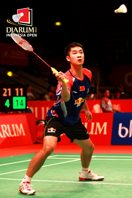 Wang Zhengming (China) bersiap mengembalikan shuttlecock ke arah Lee Chong Wei (Malaysia).