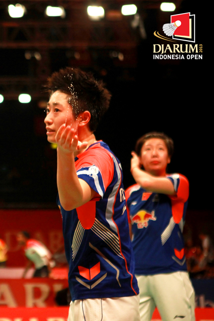 Yu Yang (China) saat mengelap keringatnya.