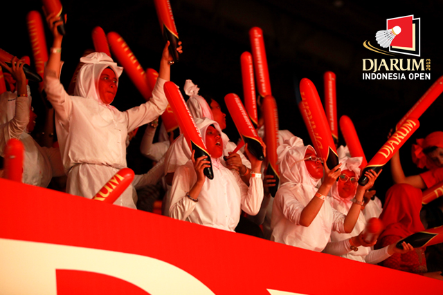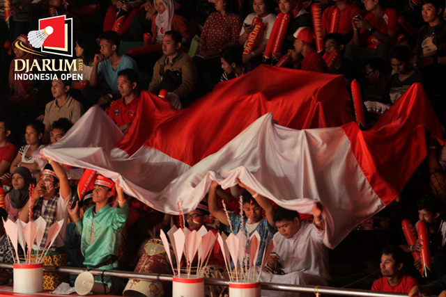 Penonton yang sedang mengibarkan bendera Merah Putih Di Istora