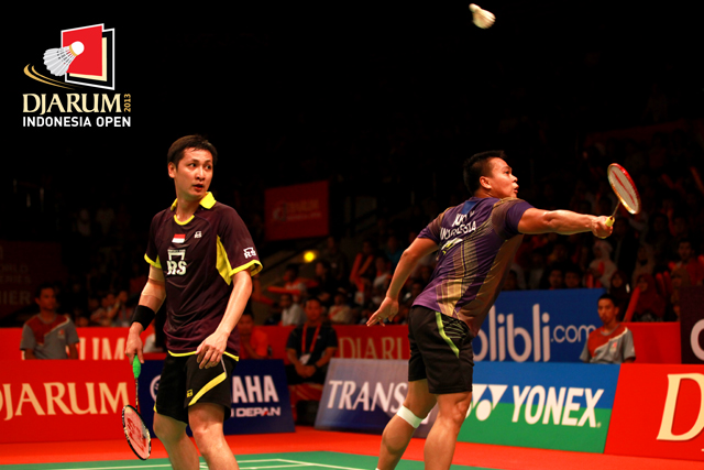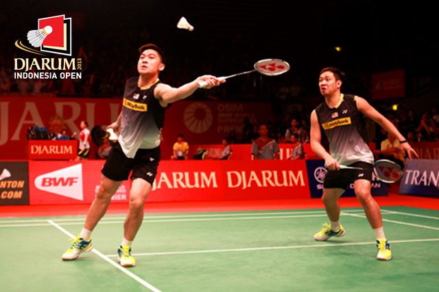 Alvent Yulianto Chandra/Markis Kido (Indonesia) melepaskan backhand ke arah pasangan Kien Keat Koo/Boon Heong Tan (Malaysia).