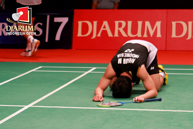 Mohammad Ahsan (Indonesia) melakukan sujud syukur setelah berhasil mengalahkan Vladimir Ivanov/Ivan Sozonov (Rusia) dan memastikan diri melaju ke final Djarum Indonesia Open Super Series PRemier 2013.