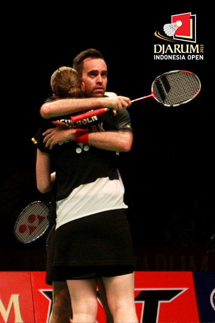 Joachim Fischer/Christinna Pedersen (Denmark) salaing berpelukan setelah berhasil mengalahkan Tontowi Ahmad/Liliyana Natsir (Indonesia) dan memastikan diri melaju ke final Djarum Indonesia Open Super Series PRemier 2013.
