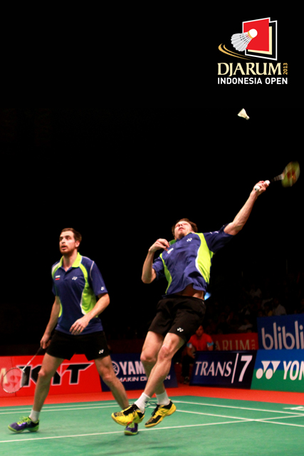 Vladimir Ivanov/Ivan Sozonov (Rusia) berusaha menggapai pengembalian dari Mohammad Ahsan/Hendra Setiawan (Indonesia).