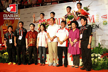 Mohammad Ahsan/Hendra Setiawan (Indonesia) dan Ko Sung Hyun/Lee Yong Dae (Korea Selatan) berpose bersama Menteri Pemuda dan Olahraga, Ketua Umum PB PBSI dan lain-lain.