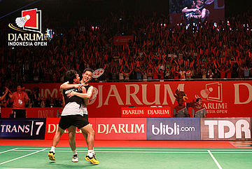 Ekspresi dan selebrasi Mohammad Ahsan/Hendra Setiawan (Indonesia) setelah berhasil memastikan diri sebagai juara usai mengalahkan Ko Sung Hyun/Lee Yong Dae (Korea Selatan) di final Djarum Indonesia Open Super Series Premier 2013.