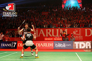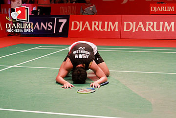 Mohammad Ahsan (Indonesia) sujud syukur setelah berhasil memastikan diri sebagai juara usai mengalahkan Ko Sung Hyun/Lee Yong Dae (Korea Selatan) di final Djarum Indonesia Open Super Series Premier 2013.