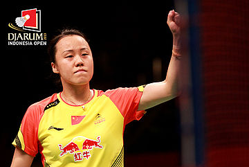 Ekspresi Zhao Yunlei (China) setelah berhasil memastikan diri sebagai juara usai mengalahkan Joachim Fischer Nielsen/Christinna Pedersen (Denmark) di final Djarum Indonesia Open Super Series Premier 2013.