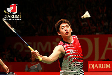 Lee Yong Dae (Korea Selatan) mengembalikan shuttlecock ke arah Mohammad Ahsan/Hendra Setiawan (Indonesia).