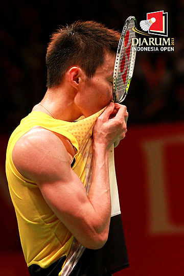 Lee Chong Wei (Malaysia) mencium bendera Malaysia yang ada di bajunya.