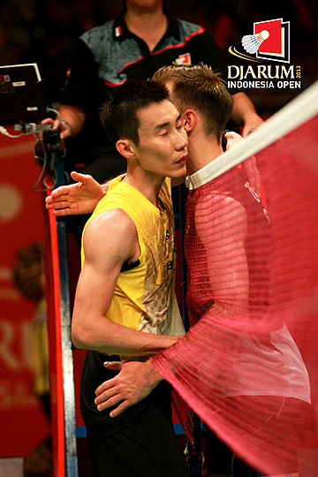Lee Chong Wei (Malaysia) berpelukan dengan Marc Zwiebler (Jerman) usai bertanding.
