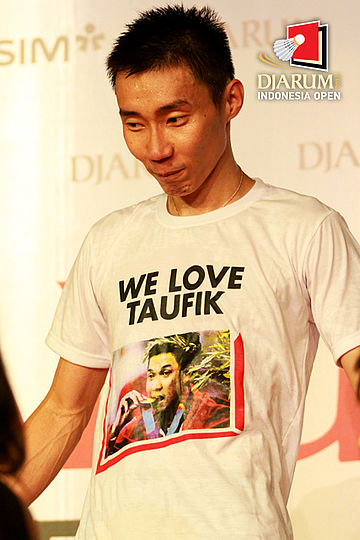 Lee Chong Wei (Malaysia) memamerkan kaos "We Love Taufik" saat menaiki podium juara sebagai bentuk apresiasinya kepada legenda bulutangkis Indonesia yang baru saja gantung raket itu.
