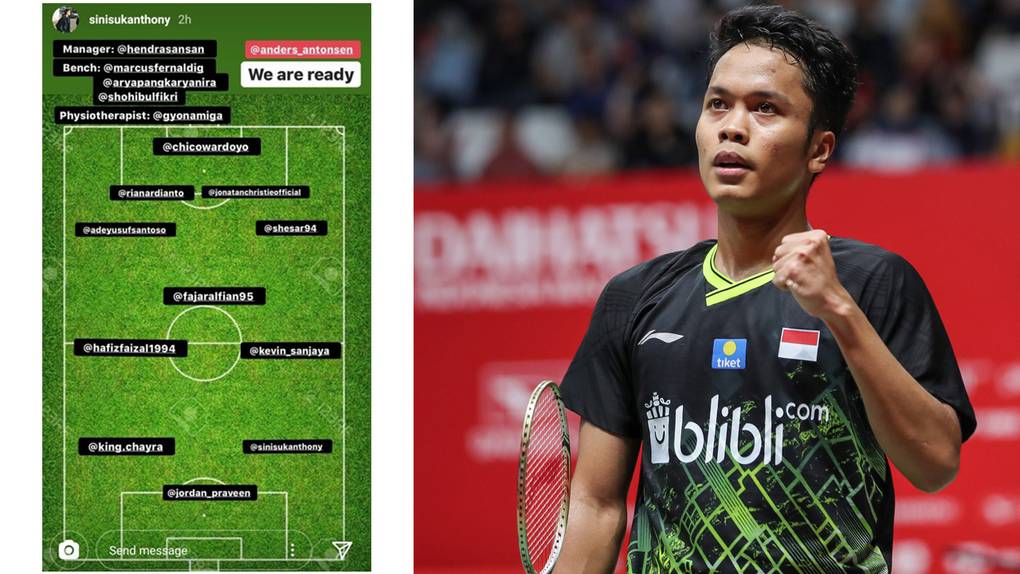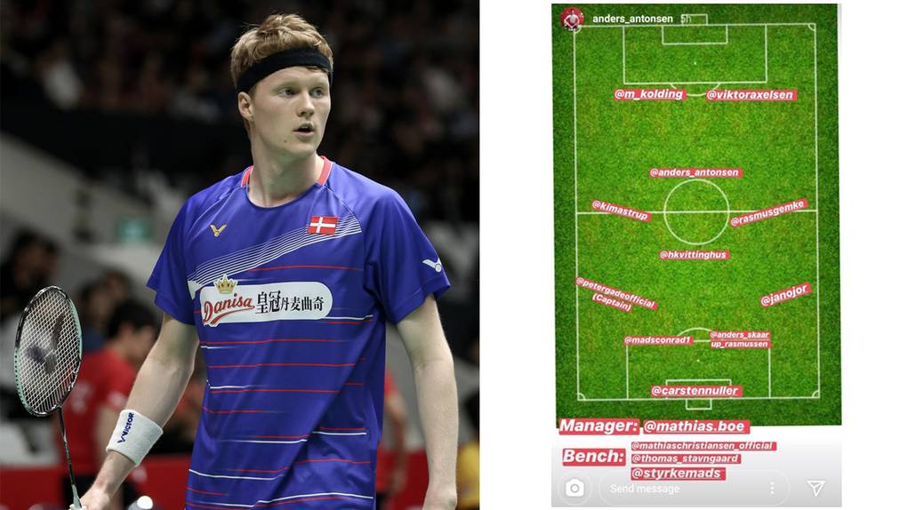 Tak lama berselang, Antonsen pun mengunggah susunan pemain ‘Timnas Denmark’ lengkap dengan skema formasi 4-4-2. Dalam formasi itu, Antonsen mengisi posisi pemain tengah atau gelandang serang (Attacking Mid Fielder). Dalam unggahan tersebut, Antonsen mempercayakan kursi pelatih kepada pebulutangkis ganda putra Denmark, Mathias Boe.
