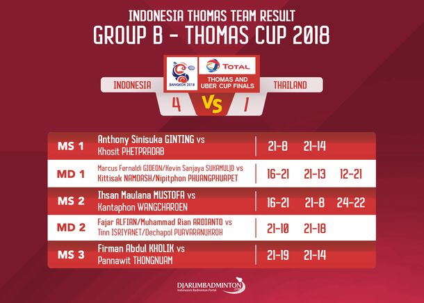Berikut hasil pertandingan tim Thomas Indonesia melawan Thailand:
