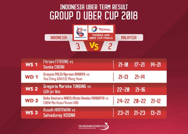 Berikut hasil lengkap pertandingan tim Uber Indonesia melawan Malaysia: