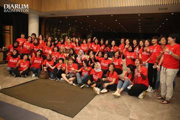Para mantan atlet putri berfoto bersama di Wisma Ploso, Kudus, Jawa Tengah, Jumat (29/4). Mereka datang ke Kudus untuk merayakan hari ulang tahun ke-54 PB Djarum.