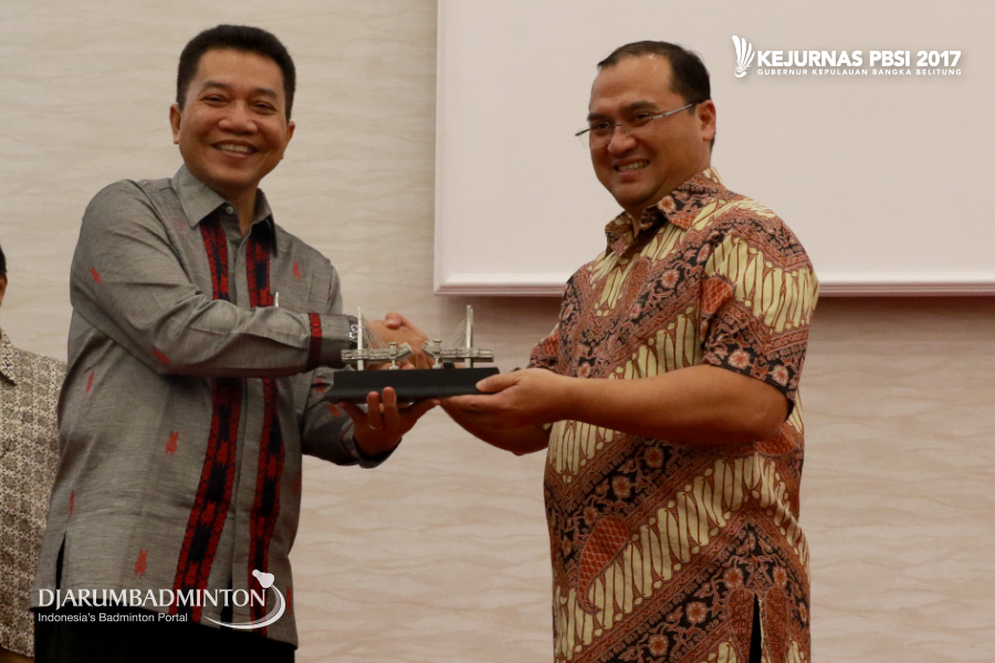 Erzaldi Rosman Djohan (Gubernur Kep. Bangka Belitung) Memberikan Cendramata Kepada Achmad Budiharto (Sekjen PP PBSI)