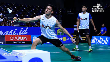 Fajar Alfian+Muhammad Shohibul Fikri (SGS PLN Bandung) Berusaha menggapai shuttlecock