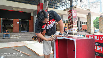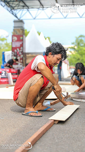 Seorang pekerja sedang mengerjakan perlengkapan logistik GUBERNUR SUMATERA SELATAN KEJURNAS PBSI 2019