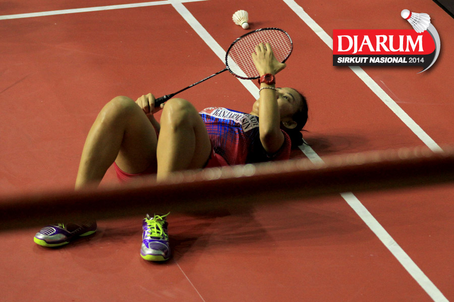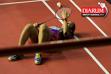 Devi Tika Permatasari (SGS PLN) harus terjatuh saat meladeni perlawanan Rizky Hidayat/Tieke Arieda (Hi Qua Wima/Jaya Raya Suryanaga)