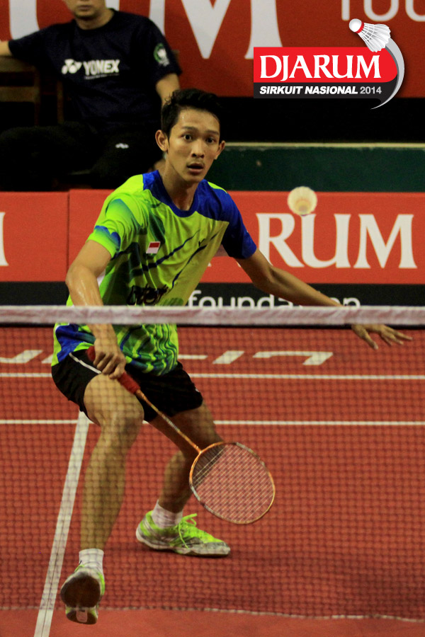 Sony Dwi Kuncoro (Tjakrindo Masters) mengembalikan shuttlecock ke arah Alvindo Saputra (Tangkas)