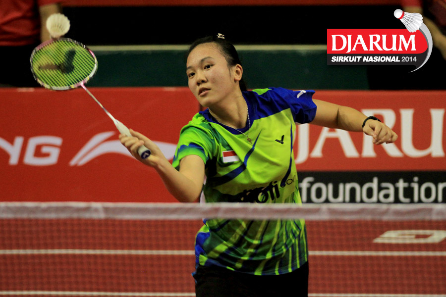 Vehrencia Debora (Pelatnas) bersiap menyambar pengembalian dari Renna Suwarno (Victory Bogor)