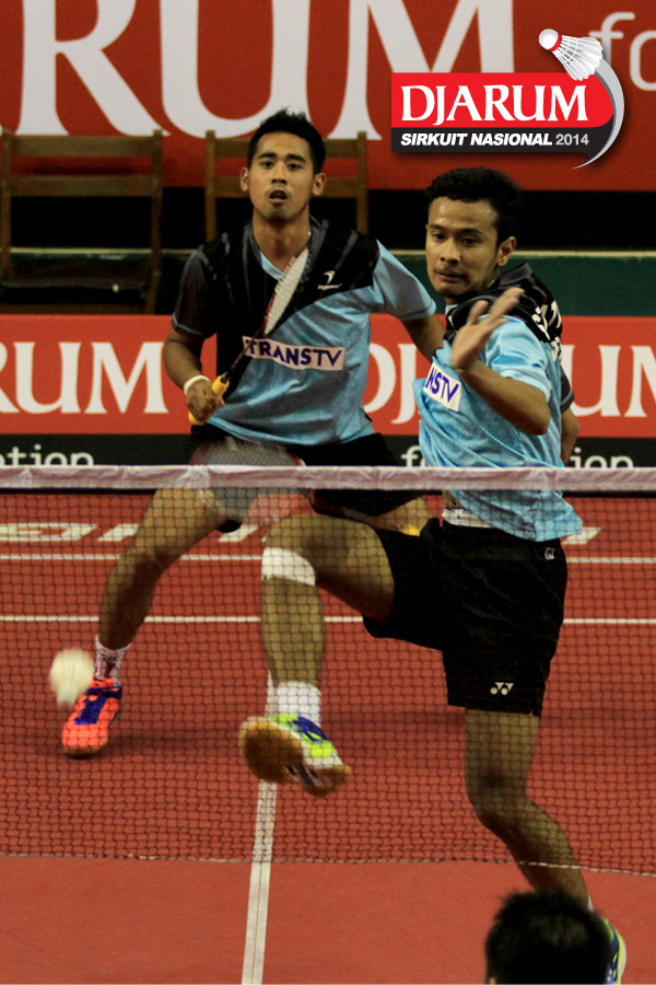 Hermansyah/Senatria Agus (Jaya Raya/SGS PLN) menyambar pengembalian tanggung dari Dicky Susilo/Rizky Kurniawan (Tjakrindo Masters/Doremi)