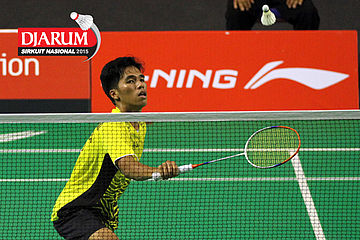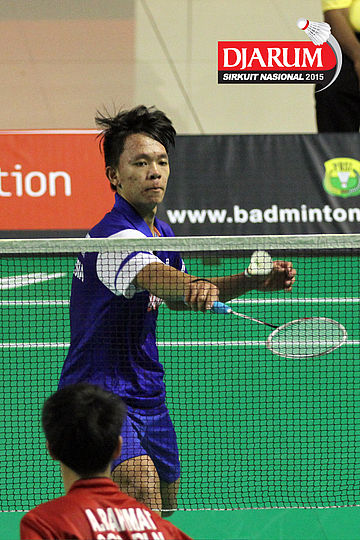 Tri Cahyo (Djarum Kudus) mengembalikan shuttlecock.