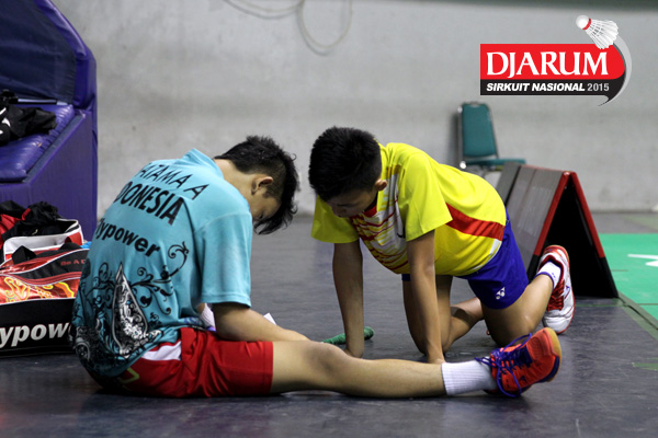Dua pebulutangkis saat menunggu giliran berlatih