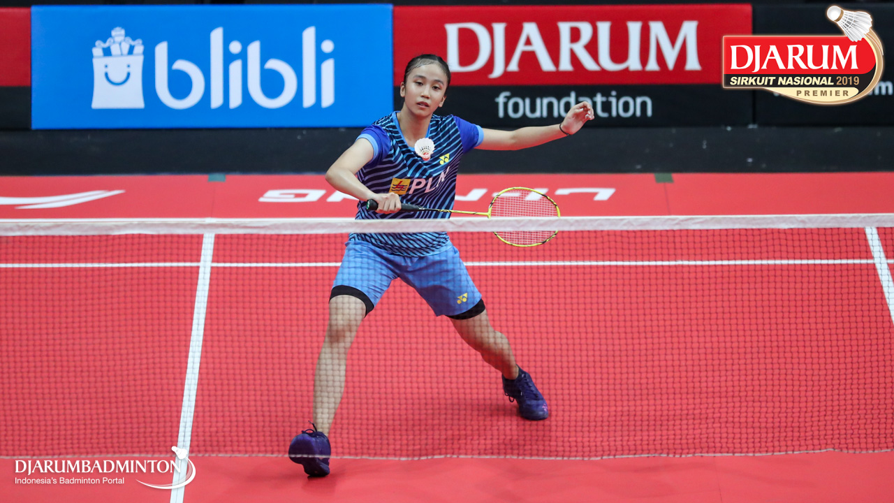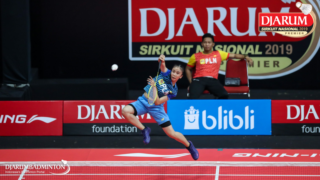 Kyla Legiana Agatha (Sangkuriang Graha Sarana PLN Bandung) menyambut shuttlecock