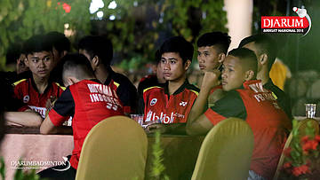 Sejumlah atlet PB Djarum Kudus terlihat fokus menyaksikan hiburan dalam acara Welcome Dinner
