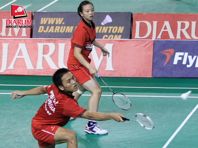 Ekspresi kemenangan pasangan pemain PB Djarum, Arsya Isnanu Ardi Putra/Della Augustia usai mengalahkan pasangan Ihsan A.W/Vicya Sandra dari Guna Dharma dengan skor 21-5 dan 21-15