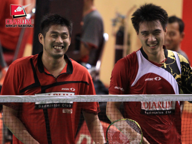 Ekspresi kemenangan Rendra Wijaya/Rian Sukmawan dari PB Djarum usai mengalahkan rekan se-klubnya, pasangan Kenas Adi Haryanto/Siqid Sudrajat di partai final.
