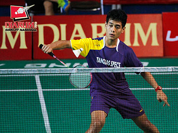 Senatria Agus (SGS PLN) mengembalikan kok ke arah Thomi Azizan (Pelatnas).