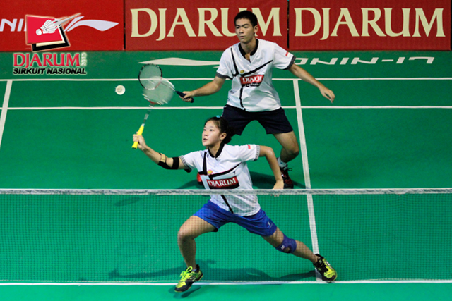 Vicky Rizky/Jessica Shohan (PB Djarum) bersiap menyambar pengembalian dari M. Yusuf/Zahrotun Khoirunisa (Hevindo).
