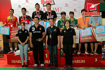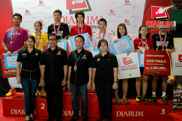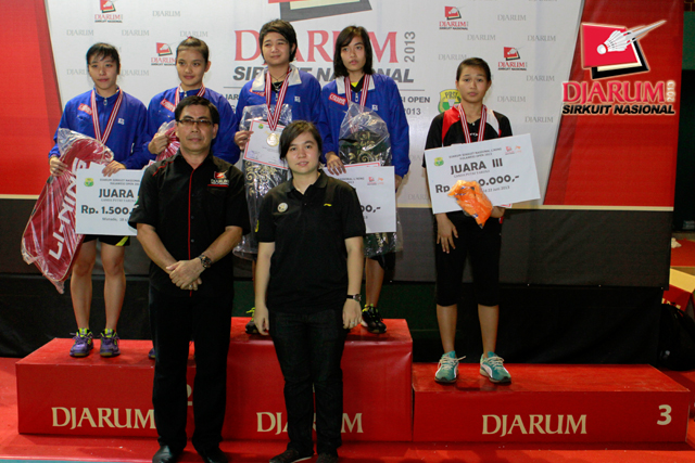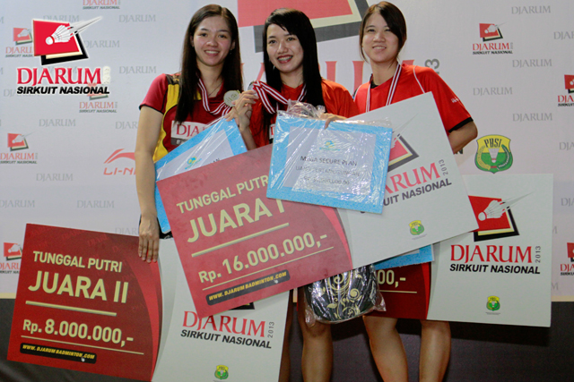 Febby Angguni, Ana Rovita dan Sylvinna Kurniawan berpose bersama di podium.