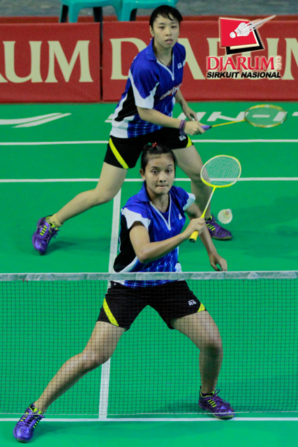 Jovita Evania Chandra/Novalita Anggraeni (Mutiara Bandung) bersiap menyambut pengembalian dari Linda Mutiara Pertiwi/Sinta Arum (Mutiara Bandung).