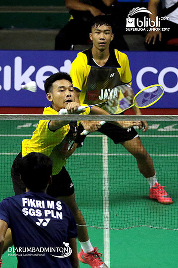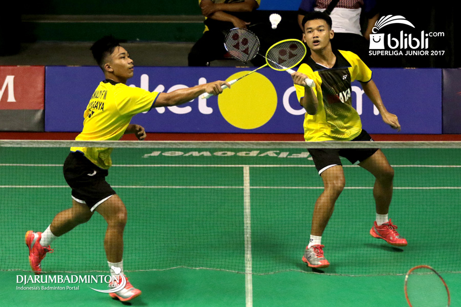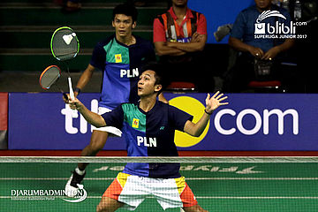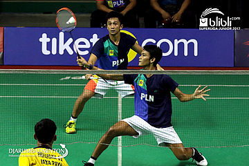 Habib Alfariz/Muhammad Sohibul F (SGS PLN) Mengembalikan Shuttlecock