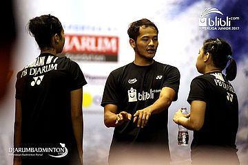Darmiko (Tengah) Saat Memberi Intruksi Kepada Indah Cahya Sari Jamil/Metya Inayah Cindiani (Djarum)